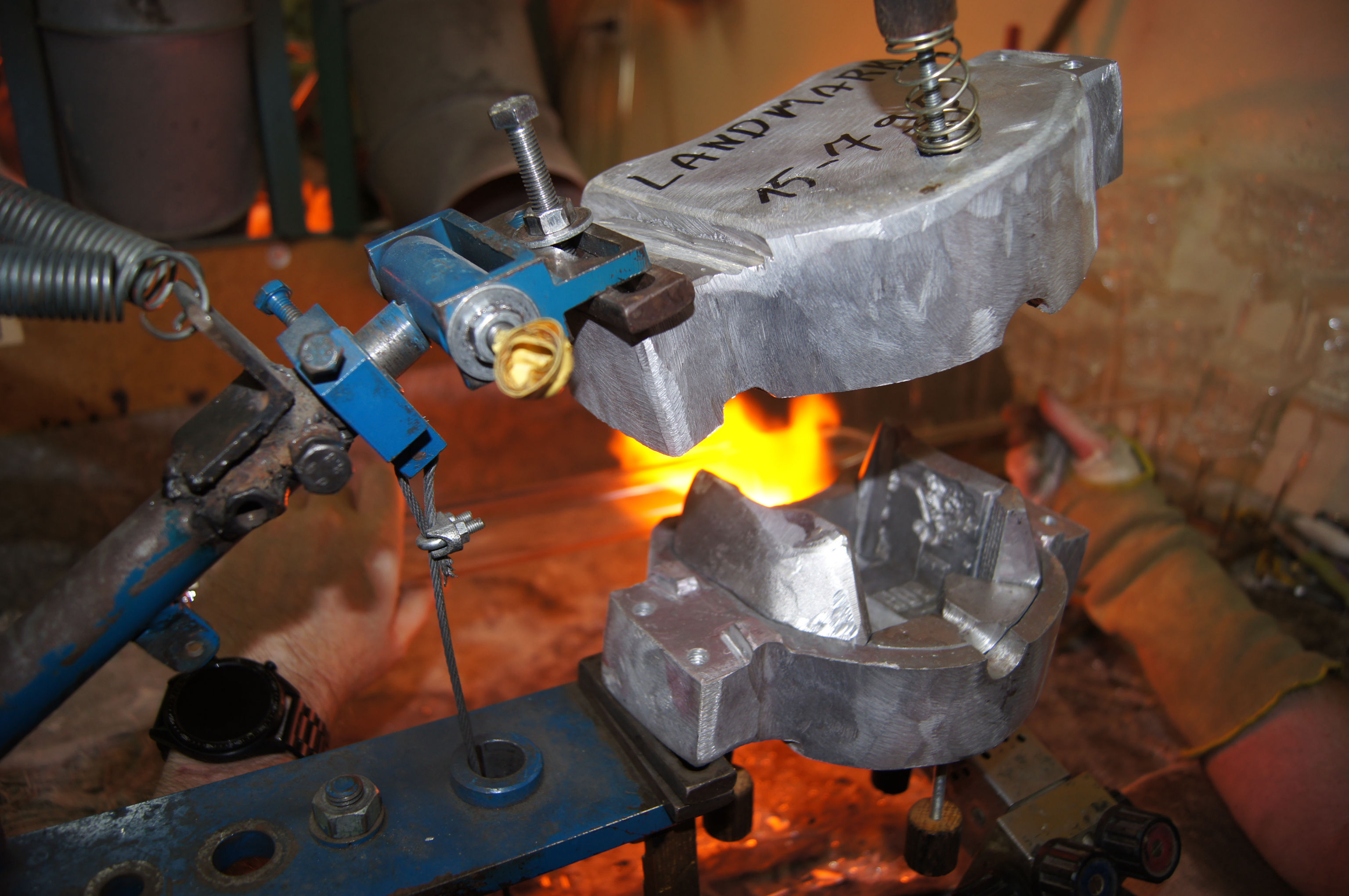 Sealing one end, the blower will blow a small ball shape before closeting the parts of the mold over it. Once closed, the blower continues to blow so that the molten glass fills the entire interior of the mold.