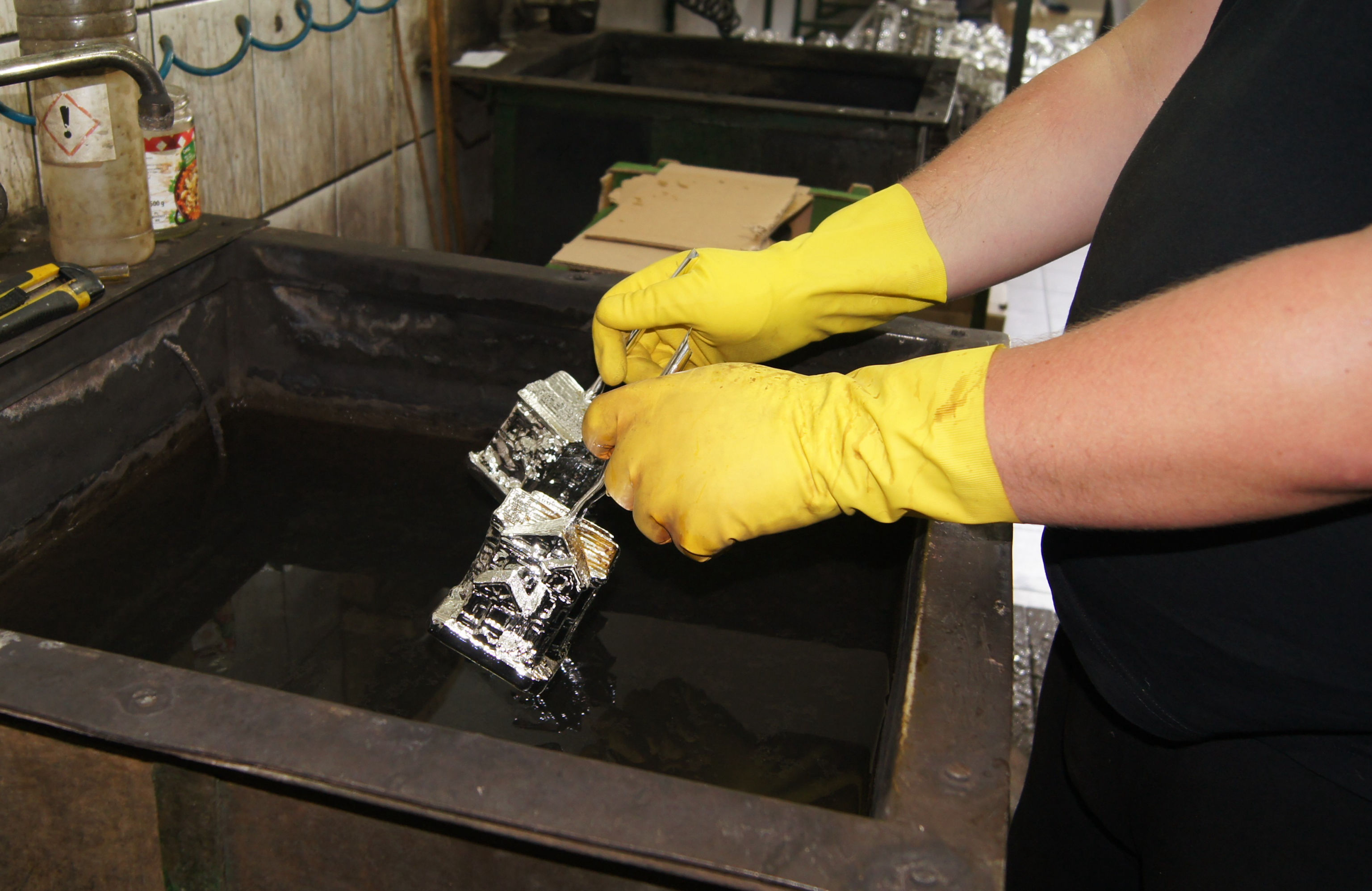After it is blown, the shape is then cooled. At this point the ball may be silvered or not. Silvering is the process by which a clear drop of silver nitrate is inserted into the glass ornament. The ornament is then submerged into a tub of hot water and shaken so that the nitrate/water solution coats the interior of the glass shape. The heat of the bath makes the nitrate turn silver and it is this silver coating on the inside of the ornament that creates the incredible luminosity in the paint used on the exterior of the ornament.