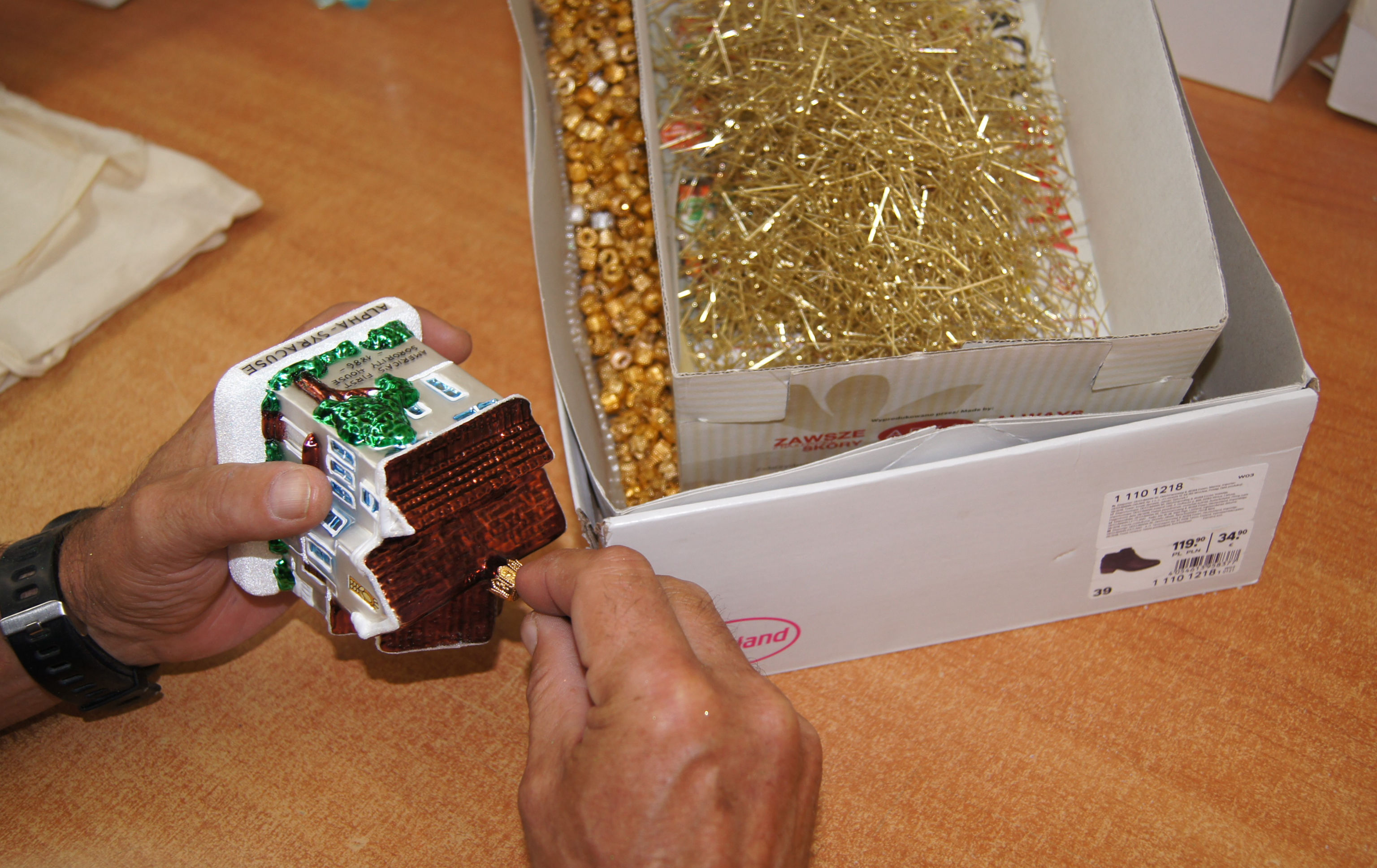 Once the paints and glitters have dried, the neck of the ornament is cut and cap, loop and medallion are attached.